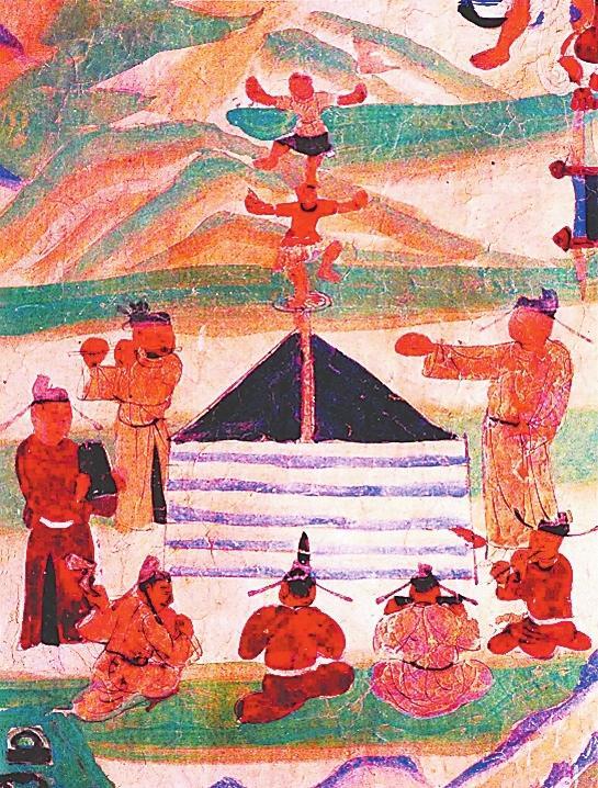 莫高窟第61窟中的《勾栏百戏》描绘了表演者演绎杂技魔术的场景