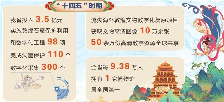 在文物保护提质升级方面,我省投入3.5亿元,实施敦煌石窟保护利用和数字化工程98项,完成洞窟保护110个、数字化采集300个,建成全球首个文物保护多场耦合实验室,制定国家和行业标准27项,科研成果服务16省市及部分共建“一带一路”国家;流失海外敦煌文物数字化复原项目获取文物高清图像10万余张,50余万份高清数字资源全球共享;第四次全国文物普查新发现线索4659条,投入24.26亿元实施900余项重要文保项目;打造河西走廊国家遗产线路,创建嘉峪关长城国家文物保护利用示范区,全省文物系统性保护成效显著,“中国特色?敦煌经验”国际影响力持续提升。