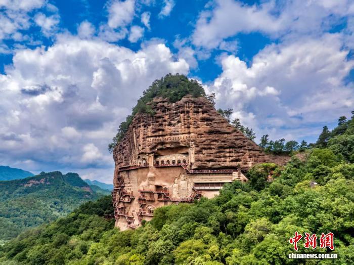 图为航拍镜头下的天水麦积山石窟。(资料图)麦积山石窟艺术研究所供图