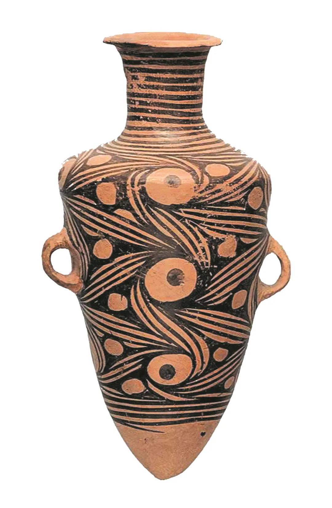 尖底彩陶瓶因器形特殊,且在仰韶文化各个类型期均有大量出土,成为仰韶文化具有代表性的器物。最开始,人们普遍认为这是一种汲水器,尖底设计符合重心转移力学原理。空瓶入水时瓶口自然向下倾斜,注满水后重心上移,瓶口自动朝上,便于提拉。后来,人们在实验中发现,尖底瓶的双耳大多位于器身的中部,汲满水后由于重心上移,在向上提拉时,会发生倾翻,无法完成取水。加之,又发现了大量无双耳的尖底瓶,因此,此种观点被抛弃。随着科技的发展,近年来,有学者开始对尖底瓶内残留物进行分析检测,发现了黍、粟等谷物发酵酒成分,提出其为一种酿酒器,而甲骨文“酉”字看上去正是一个尖底瓶。越来越多的证据表明,尖底瓶功用为一种实用的酿酒器。甘肃省博物馆收藏的陇西吕家坪出土马家窑类型期的旋涡纹尖底彩陶瓶,通体施黑彩,颈部饰平行条纹,肩腹部绘四方连续涡纹,极富动感,成为彩陶艺术的力作。