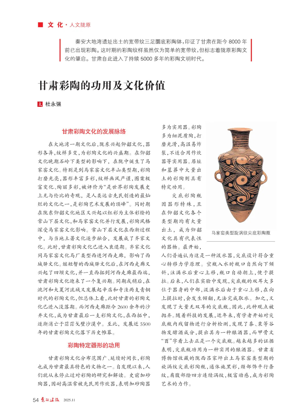 甘肃彩陶文化分布范围广、延续时间长,彩陶也成为甘肃最具特色的文物之一。自发现以来,人们就从未停止过对彩陶的研究和解读。史前加砂陶器,因耐高温常被先民用作炊器,表明加砂陶器多为实用器。彩陶多为细泥质陶,打磨光滑,高温易炸裂,不适合用作炊器等实用器。居址和墓葬中大量出土的彩陶则具有特定功用。