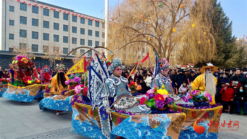 作为西北社火艺术的典型代表,和政秧歌以阵容严整、程式完备、看点密集著称。完整队伍由前五角、中三角、后五角与串火杂角构成,进退有序、层次分明。旱船是开篇重头戏,分八只、四只、两只、单船形制,分别取材“东吴招亲”“平章游西湖”“千里送京娘”等经典典故,明船护卫暗船,伴以《十绣》曲调与专用鼓点,稳荡、飞驰、旋涡、搁浅等招式一气呵成,八船同演时更有打斗盘旋的戏剧张力,气势酣畅,极具感染力。